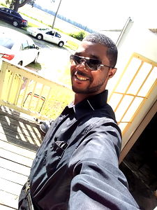 A young man is taking a selfie outside, smiling and looking towards the camera. He's wearing sunglasses, a black shirt, and appears to be in a good mood. Behind him is a house with a porch. In front of him is a deck with some stairs leading up to it. The sky is clear, suggesting a sunny day.