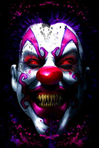 Vivid and detailed illustration of a clown with striking makeup, set against a dark backdrop. A unique blend of color and shadow highlights the character's intricate facial features. 20th-century horror vibe.