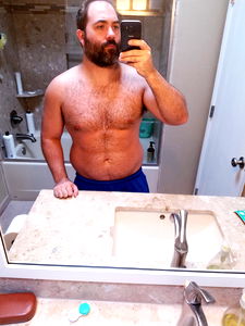 A fitness model showcasing his physique, taking a selfie. He is shirtless with visible muscles, standing in front of a bathroom vanity. The photo appears to be taken for personal use or social media content, highlighting a moment of pride and accomplishment. OnlyFans model Itameyourkitty is captured, showcasing his well-toned body and the effort he's put into maintaining it.