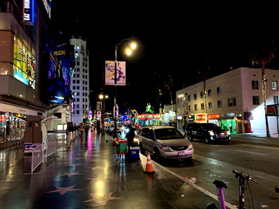 This image captures the vibrant energy of Hollywood Boulevard at night, with its bustling streets illuminated by neon signs and city lights. The area is lively, with people moving about and cars parked along the curb. The wet sidewalk reflects the myriad colors of the surroundings, adding a reflective quality to the scene. It's a snapshot of urban nightlife, showcasing the city's pulse in its most active hours.