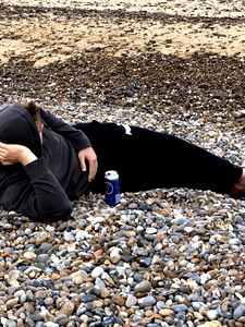 A young male, possibly in his late teens to twenties, is casually lounging on a rocky beach. He has short hair and appears to be enjoying some downtime with a can of soda nearby. The beach looks peaceful and serene, with no other people visible in the image.