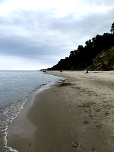 A tranquil beach setting under a cloudy sky, featuring a sandy shoreline with waves gently lapping against the shore. The calm atmosphere is enhanced by the distant horizon where the land meets the sea.