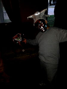 A playful image of Armando Casas, donning an unusual costume and standing in front of a couch.