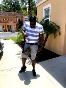 Model 1zulu confidently poses outdoors. Dressed in a chic fur jacket and white sneakers, he exudes an air of sophistication. His outfit is completed with a casual white T-shirt and blue jeans.