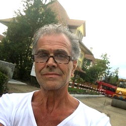 A middle-aged man with grey hair, glasses and a casual white t-shirt. He's taking a selfie outdoors, standing in front of a yellow building, possibly a residential house or an office. His expression is neutral, and the background suggests it might be daytime.