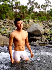 Carls, the renowned Onlyfans model, is seen posing in a serene setting amidst nature. He is standing in a stream with his body facing forward.
