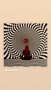 A striking piece of modern art that captures the viewer's attention. The mesmerizing pattern evokes a sense of calm and introspection, as the person at the center appears to be contemplating something. This abstract design would make an excellent addition to any contemporary living space.