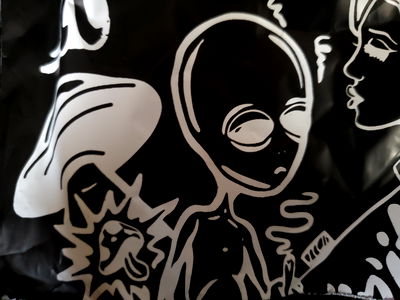 This image showcases a vibrant, hand-drawn alien cartoon featuring three unique characters. The artwork is rich in detail and uses bright colors to create a lively scene. It's a delightful piece that can bring joy and amusement to any space enthusiast or collector of quirky pop culture art.