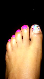 This is a model photo of Chocolate Princess, a foot fetish account on OnlyFans. In the image, we see her showcasing her toenails in an artistic manner. She has applied colorful nail polish in a unique and visually appealing way. Her toes are painted with different shades of pink, blue, and green, creating a vibrant contrast against the black background of the photo. This type of foot art is quite popular on social media platforms like Instagram and TikTok, where users often share their nail polish creations to showcase their creativity and personal style.