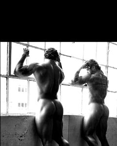 This image depicts a muscular man in his late twenties, positioned indoors against a wall with a chair nearby. He is shirtless, revealing a well-toned physique with prominent chest and stomach muscles. His bare skin is well illuminated, showcasing his well-defined muscles. His elbows and thighs are also visible, contributing to the overall impression of fitness and strength. Despite the lack of clothing, a hint of fabric can be detected, suggesting that he might have recently removed a piece of clothing or that there is clothing elsewhere in the frame. The man's face, a key feature of the image, displays a range of expressions that might be indicative of the situation or his emotions. His facial features are quite clear, suggesting a close-up or well-focused shot. The wall in the background and the chair provide a sense of location, suggesting an indoor setting, possibly a home or a gym.
