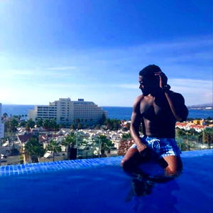 Deejay, a popular fitness model, showcases his impressive physique on a balcony overlooking a beachfront resort. With a chiseled frame, he's the epitome of health and vitality.
