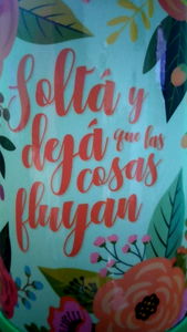 Brightly colored painting of flowers with the phrase 'Solo y desig' written on it in a stylized font, likely a piece of wall art or a decorative card. The text is in Spanish and translates to 'On my own without desire.' It appears to be a cheerful design meant for home or gift giving.