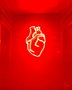 A stylish red neon heart lighted against a dark wall in a modern bathroom setting. Ideal for those who love contemporary design and a subtle pop of color. Perfect accent piece to bring warmth to your space.