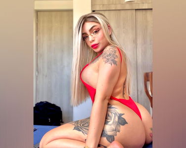 Valentina L, a striking model known for her unique blend of style and confidence, is captured in this image. She's dressed in a vibrant red swimsuit that contrasts beautifully with the white walls and flooring in the background. Her tattooed arms add an element of intrigue to her look. Whether she's posing on a bed or on a couch, Valentina L always exudes an air of allure and mystery.