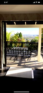 A serene outdoor space with a view of the city. The patio is furnished with a bench and chairs, inviting one to sit and enjoy the surroundings.
