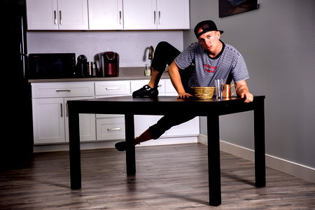 This is a black and white photograph of a SoCal-based individual. The person has a beard and is wearing a cap backwards, giving off a casual vibe.
