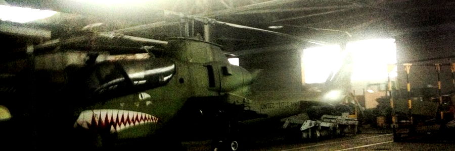 An image depicts a person in an indoor setting, surrounded by military equipment. They are standing close to an open hatch on a vehicle, which appears to be a helicopter or military aircraft. The individual is wearing casual clothing and has their hair styled in a unique manner with a prominent white streak down the middle.