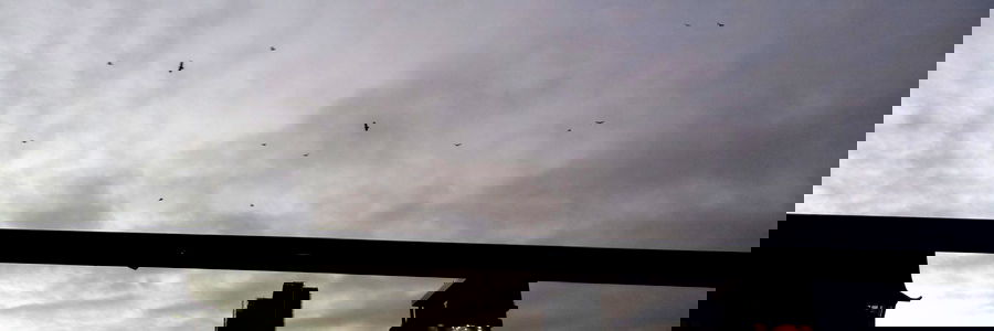 The image captures an urban landscape bathed in the soft light of either dawn or dusk. The silhouette of buildings and trees punctuates the horizon, while birds add a touch of life to the scene.