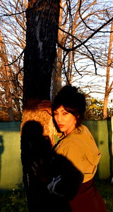 A woman stands against a tree, casting a silhouette. She is dressed in a green top and shorts, looking to the side with a contemplative expression.