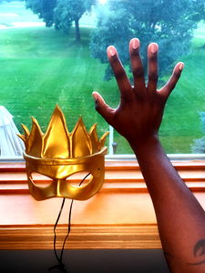 The Price of Vanity stands confidently with a golden crown mask, showcasing a unique fusion of fantasy and reality.