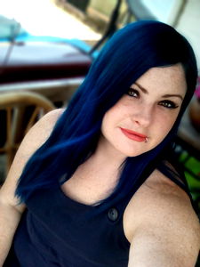 A model with a striking blue hairstyle poses confidently, sharing a moment of personal style.
