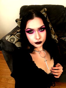 Vivian Valla, a well-known OnlyFans model, radiates an air of allure with her dark aesthetic. Her makeup is dramatic, and she sports an edgy necklace that adds to her enigmatic persona. In the image, she's sitting on a couch, capturing our attention with her striking gaze.