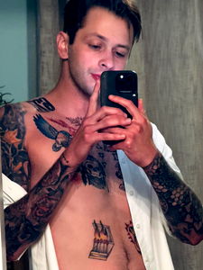 In this image, we see Vxwsky, an OnlyFans model from Atlanta who collaborates in North Carolina. He is seen taking a mirror selfie in his bedroom, showcasing his heavily tattooed arms and abs. His confident demeanor and physique are on full display as he captures the moment with his cell phone. Vxwsky's tattoos and muscular build are clear indicators of his fitness journey.