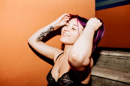 A young, adult female with vibrant purple hair wearing lingerie and a necklace. She has visible tattoos on her upper arms. In the background is a room corner and part of another individual who appears to be male, as indicated by the short beard and dark hair. Haytrent is likely an OnlyFans content creator specializing in adult modeling.