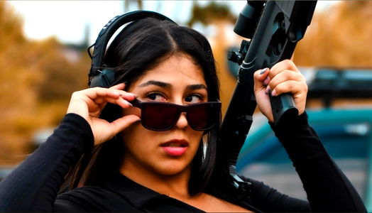 A scandalous and sensual image of a woman from Costa Rica, who is an OnlyFans model, posing in a provocative manner while holding a rifle. She is wearing a white bra and panties, emphasizing her body. The setting appears to be an outdoor area, possibly a dirt road or a similar location.