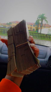 A person casually holds a large stack of money in a car, presumably having just made a sale or transaction. This image could be associated with topics such as sales, finance, entrepreneurship, luxury lifestyle, and even social media influencers who showcase their earnings.
