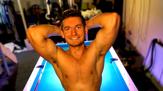 This image captures a shirtless male individual, evidently in the prime of his life, showcasing his well-defined muscles. He appears to be in his early thirties, in a state of excellent physical fitness. His bodybuilding efforts are clearly discernible, the contours of his muscle definition visible on his chest, shoulders, and stomach. His arms are positioned such that his elbows and joints are identifiable, perhaps holding something out of the image's frame. His face, a portrait of determination, is in sharp focus and contributes to the overall intensity of the scene. The background of the image is a wall, suggesting an indoor setting. This could be a personal gym or a fitness studio, a haven for his strenuous workouts. The man's bare-chested appearance underlines his dedication to bodybuilding, showcasing the results of his committed fitness regimen. The image is a powerful representation of physical strength and discipline, a testament to the man's commitment to bodybuilding and physical fitness.