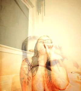 A photograph of a woman with tattoos and piercings in a glamorous pose for a modeling portfolio. She wears an embellished top with lace elements and has her hair styled up. Her makeup is done with a neutral palette and she has a relaxed demeanor.