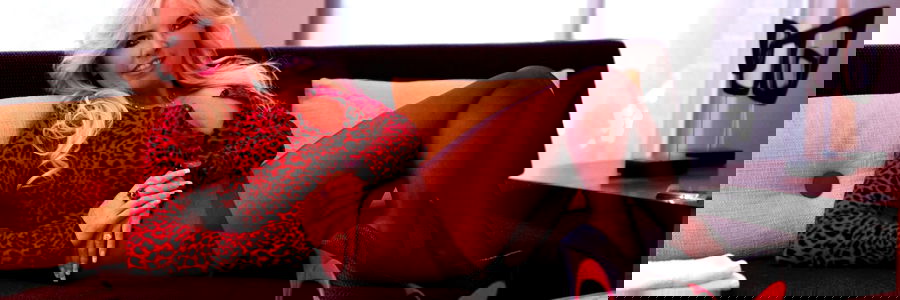 This image depicts a stylish indoor setting, where a woman in her late thirties is seated comfortably on a sofa. The woman, the central figure in this photograph, has an alluring and confident air about her. She is dressed in bold, red clothing that contrasts brilliantly with the muted colors of the surrounding room. Among her attire, a pair of high heels and a hint of lingerie are visible, making a statement about her bold fashion choices. The woman's face is clear and well-defined, suggesting an air of self-assuredness. Her stylish high heels and the fashion accessory she is wearing add an additional layer of sophistication to her overall appearance. The comfortable couch, the wall behind her, and other furniture pieces in the room create a cozy indoor ambiance. The room seems to be well-furnished, with a homely feel, yet also exuding a touch of luxury. Overall, this image captures the essence of a modern woman who is comfortable in her skin and her surroundings, blending style with comfort effortlessly.