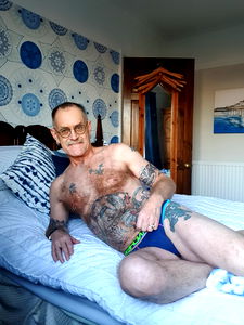 A man with tattoos takes a selfie in his underwear, showing off his teddy bear and other accessories, set against the backdrop of a home. The setting is casual and comfortable, highlighting the model's unique style and character.