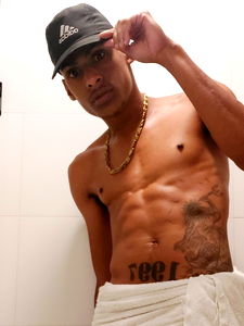 A fit young man from Brazil showcasing his physique and confidence. Wearing a white towel, he strikes an intense pose, reflecting his Onlyfans presence.