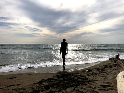 An artistic black and white photograph capturing a silhouette of a person walking along the beach during sunset. The scene is tranquil with the ocean horizon line, clouds, and a wooden post visible in the background. The individual appears contemplative, adding an air of mystery.