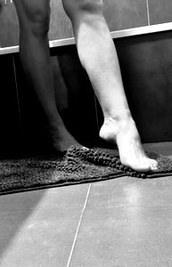 A full-length, color photograph of an adult female model posing in a pair of black leggings with high heels and one leg slightly lifted. She has dark hair, and her pose suggests movement or dance. Her attire consists of high-heeled boots and leggings. The image appears to be taken indoors, on a hardwood floor near a cabinet or similar furniture, with a door in the background.