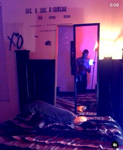 A snapshot of an OnlyFans model's personal space, showcasing a well-kept bedroom with a reflection in the mirror.