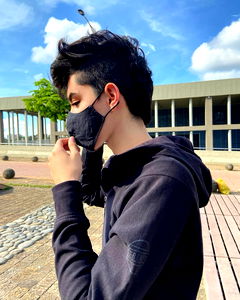 An individual wearing a black face mask, taking a break by a building. The person appears to be young with short hair and is dressed in casual clothing. The background suggests an urban environment with a clear sky.
