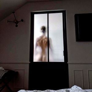 In the image, there is a man standing in a room. He appears to be in his mid-20s and is shirtless. He has short hair and is looking directly at the camera with a slight smile on his face. The man seems to be in casual attire, with only one shoe visible. Behind him, there is a door that suggests he is in an interior space, possibly a living room or bedroom given the presence of a bed frame in the background. His pose and expression suggest that he is aware of being photographed, but not overly posed.