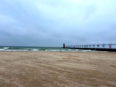 A serene and cloudy beach setting with a lighthouse in the background, featuring the iconic xoxo lighthouse at Portland.