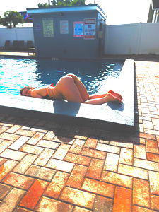 A photograph of the model Xstarlightxo, a female adult, reclining on a poolside chair with one leg crossed over the other. She has long hair and is wearing a white t-shirt. The background features a partially cloudy sky and an outdoor dining set.