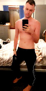 A picture of a young adult male. He is shirtless, standing confidently in a room with exercise equipment and weights in the background.