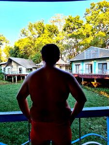 The image features a man dressed in red swimwear, leaning casually against a rail. He is looking out towards a serene rural setting where houses are visible, suggesting the photo might have been taken during a vacation or leisure trip. The man's relaxed posture and the tranquil surroundings evoke a sense of calm and enjoyment.