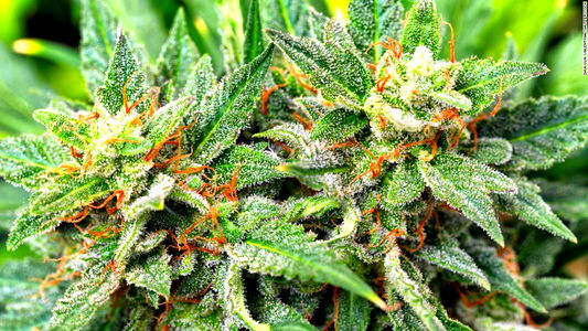 Photograph of a close-up marijuana bud. The plant is vibrant and healthy, with a rich, green color that suggests freshness and high quality. The background is out of focus but appears to be an outdoor setting with natural light enhancing the colors and textures.