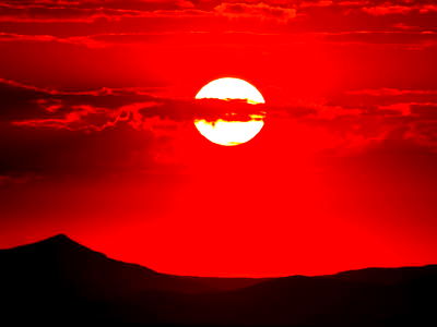 Vivid red sunset with a dramatic sky, casting a warm glow over the landscape.