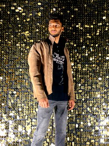 A dynamic and professional model pose with a golden backdrop, featuring shimmering disco balls.
