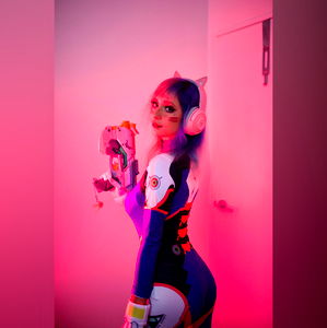 Vibrant cosplay photo capturing the spirit of a dedicated gamer. The model, identified as โMoxie, exudes enthusiasm and passion for gaming, reflected in their attire that mirrors the game's theme. The background is dimly lit with an emphasis on pink, creating a striking contrast and highlighting the subject. A small dog toy adds a touch of whimsy to the scene.