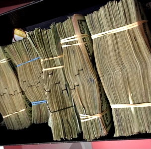 This image showcases a large amount of cash, meticulously stacked and secured with blue bands. The money appears to be freshly minted and is ready for transport. It could possibly represent earnings from a successful business or event.