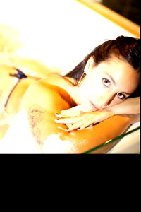 An OnlyFans model posing seductively on a bathtub, showcasing her lingerie. She appears to be in an intimate setting, capturing a candid moment. Her expression is relaxed and inviting.